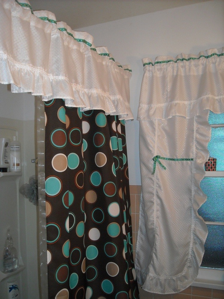 Шторки на окне и шторки, закрывающие ванну исполнены в одинаковом стиле-основная отделка в белых тонах гармонирует ванными приборами.