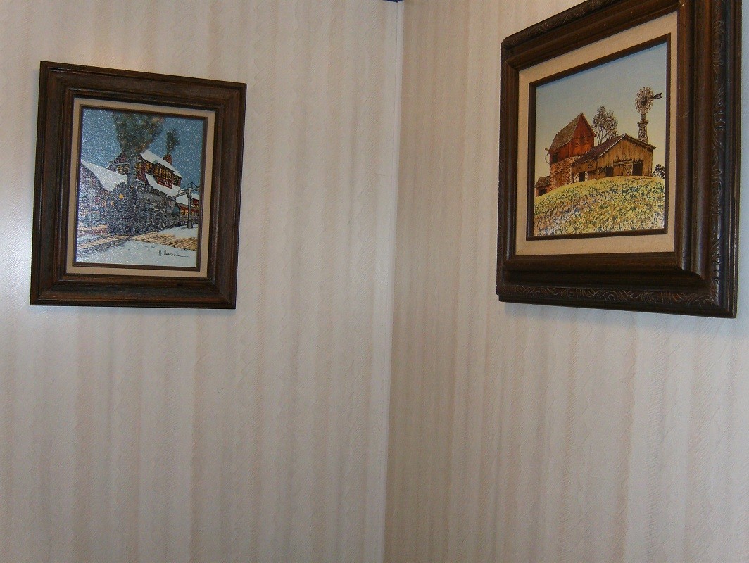 Стены душевой украсили картинами, повесели удобные полочки, поставили небольшую раковину вмонтированную в тумбочку.