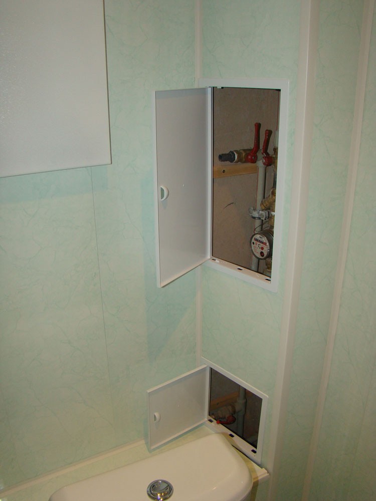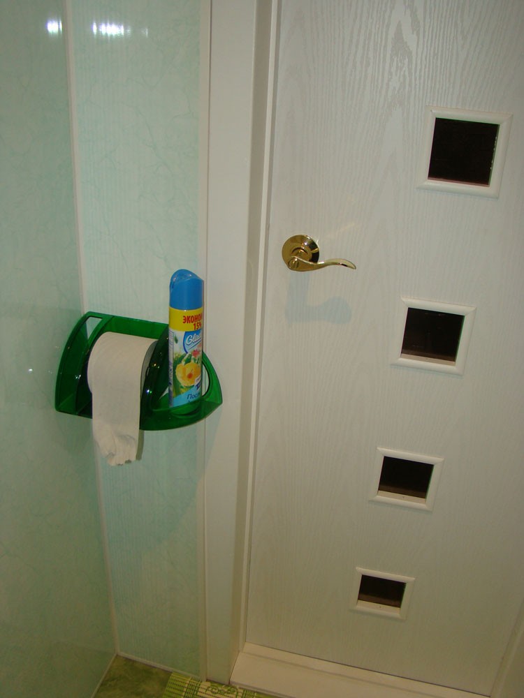 Двери в туалет и ванную сделаны из специальной фанеры со встроенными матовыми стеклами черного оттенка.
