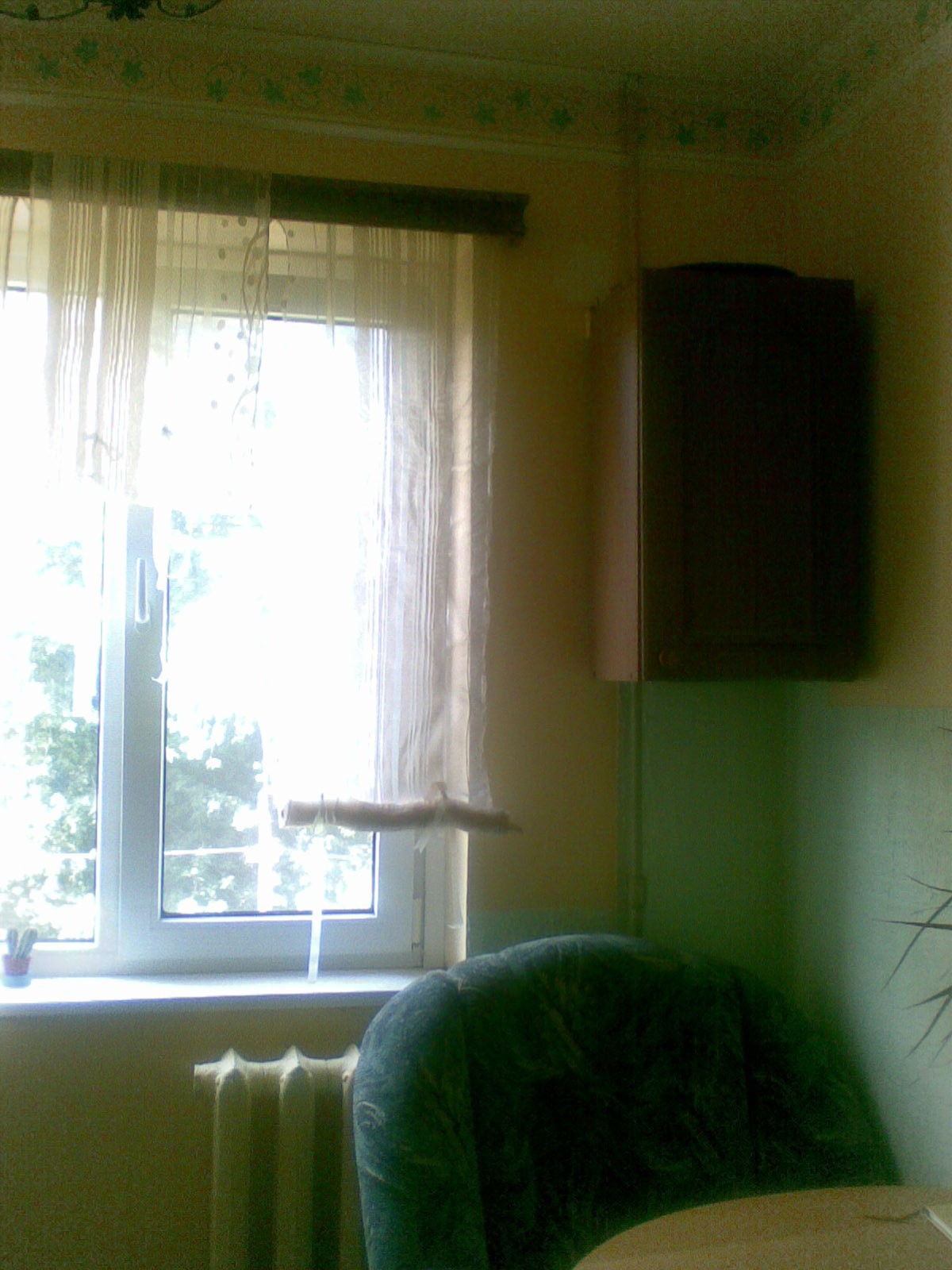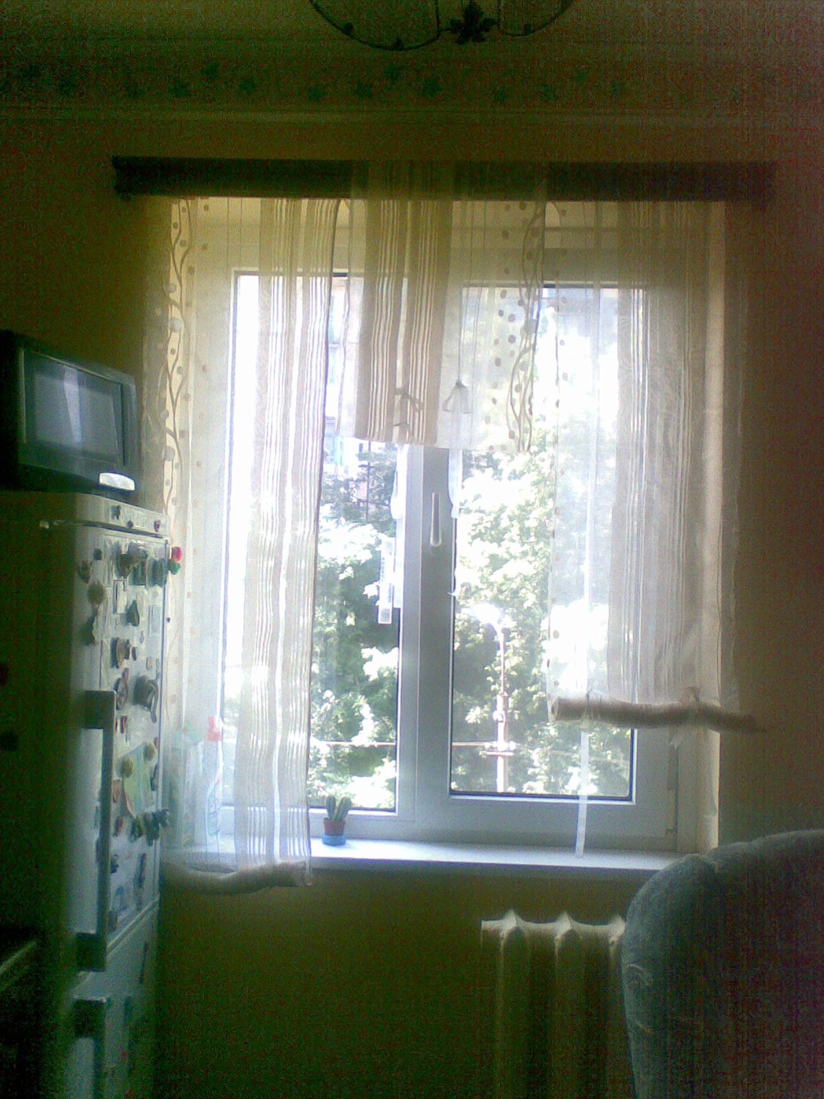 Окно оформляли оранжевыми шторами в полоску.