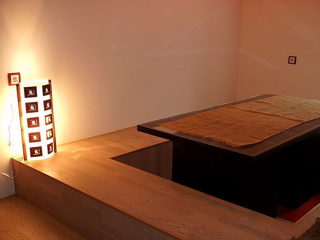 В случае кухни-это два красных квадрата(тонированная в красный цвет широкая паркетная доска из натурального ясеня).Эти квадраты уложили внутри подиума,в котором была расположена обеденная зона и опущена ниже уровня пола.