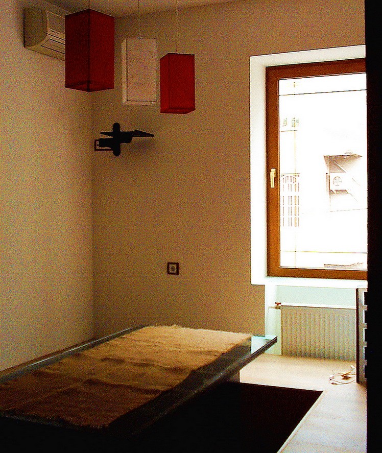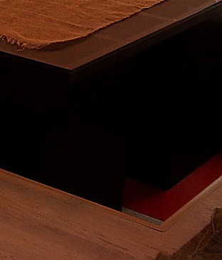 Ноги стола выглядят,как два ,довольно громосских,квадрата,стоящих на двух красных квадратах на полу.И,по-моему мнению,красный очень выгодно подчеркивает темное,почти черное,дерево стола.