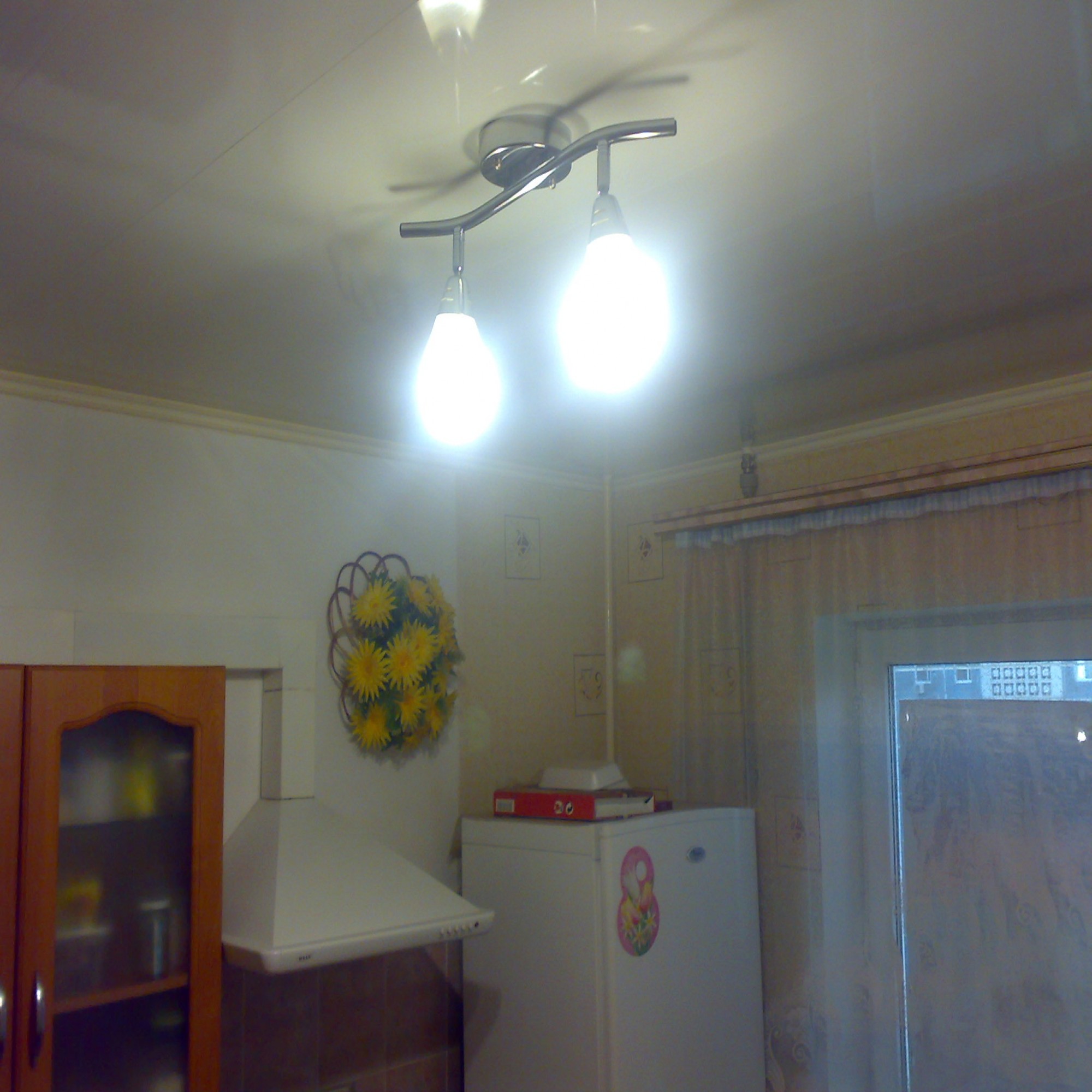 с подвесным потолком пришлеся неслабо помучаться, но в итоге я доволен! Люстра авнгардной формы с економ лампочками