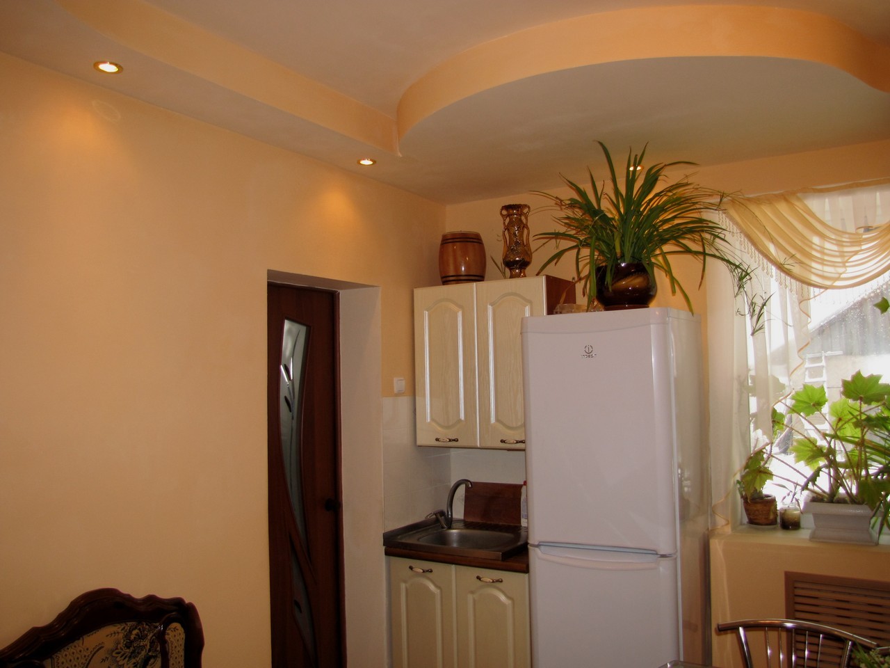 Решили вместо обоев применить покраску в теплых тонах. В двухуровневых потолках удобно разместить дополнительное освещение.