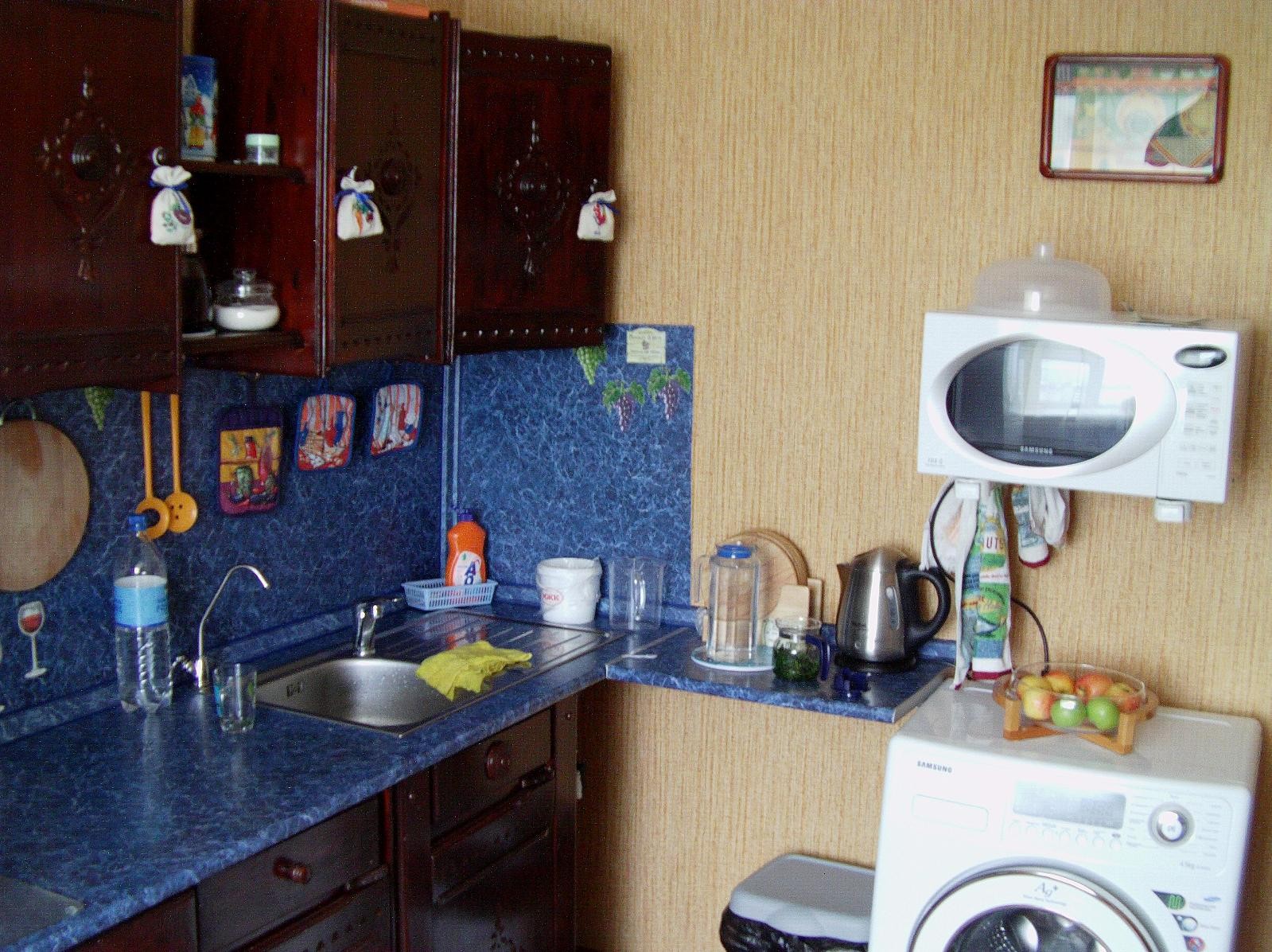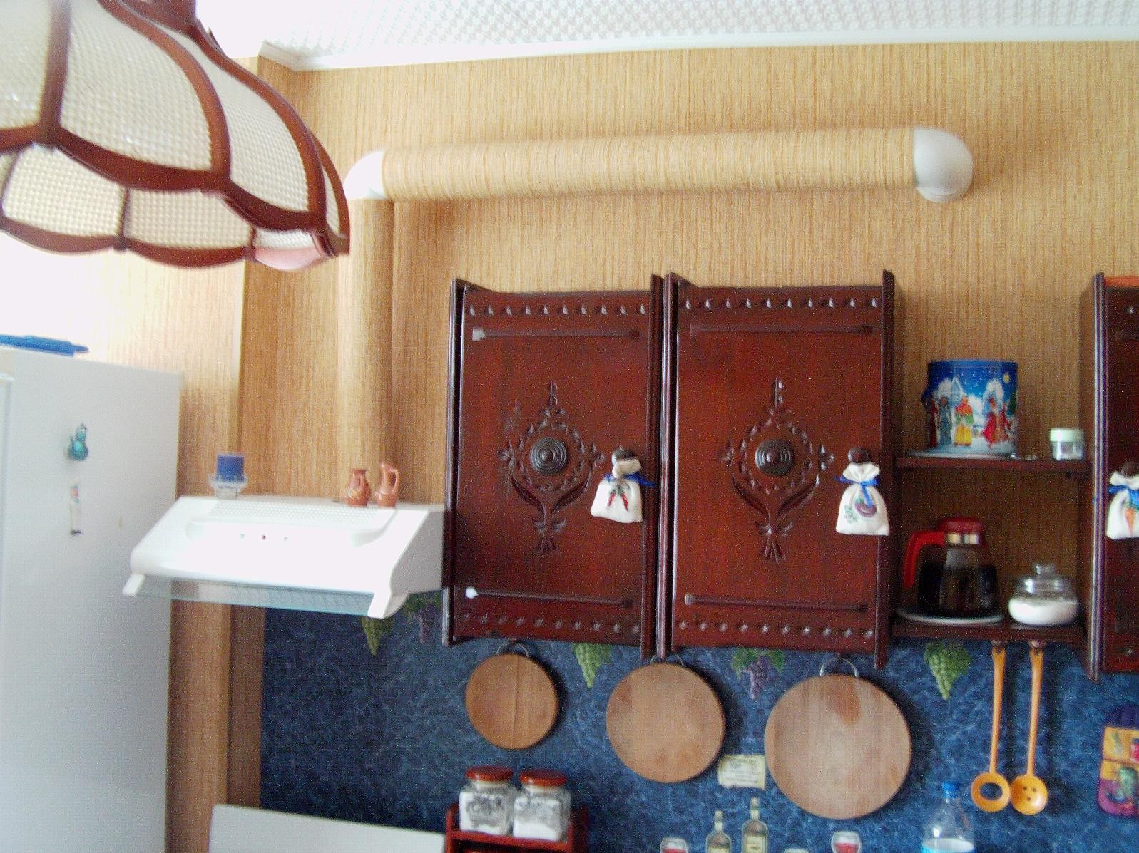 Сам кухонный гарнитур достался нам от бабушки с дедушкой, этот комплект переезжал с нами из города в город 3 раза, панели мы оформили декупажем, а на ручки повесили декоративные мешочки с вышитыми на них овощами.