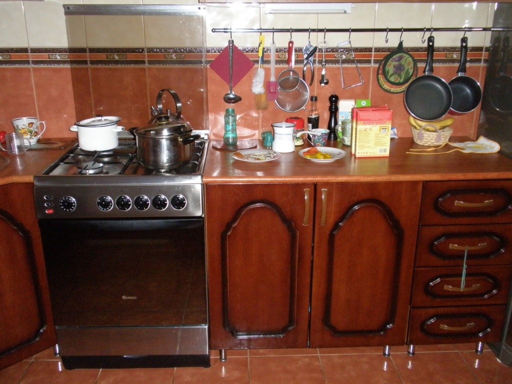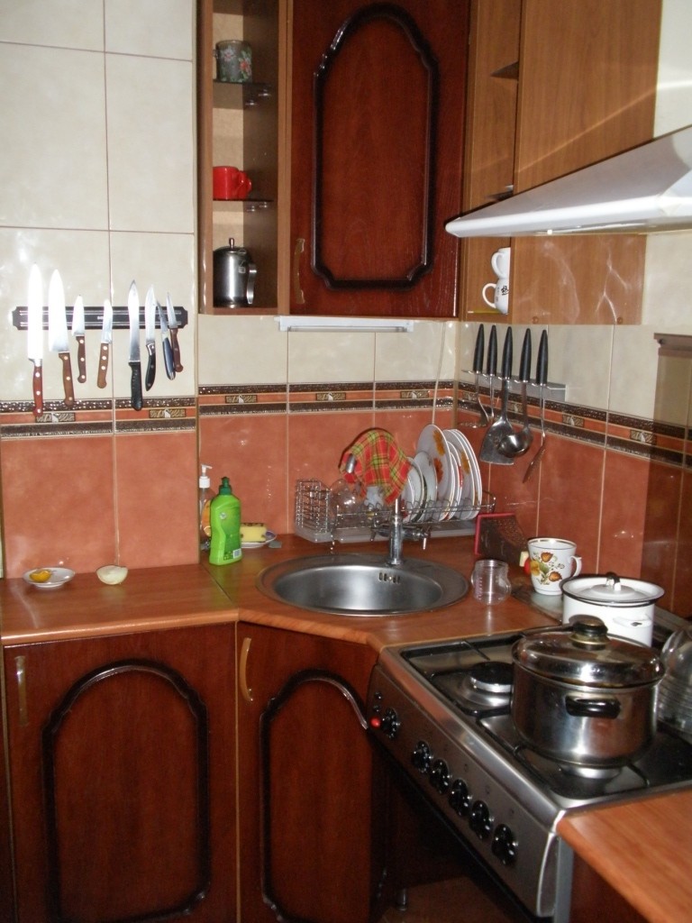 Рабочая зона- плита с вытяжкой, справа рабочий стол (внизу и сверху шкафы), а спева мойка. Очень удобно, что все рядом
