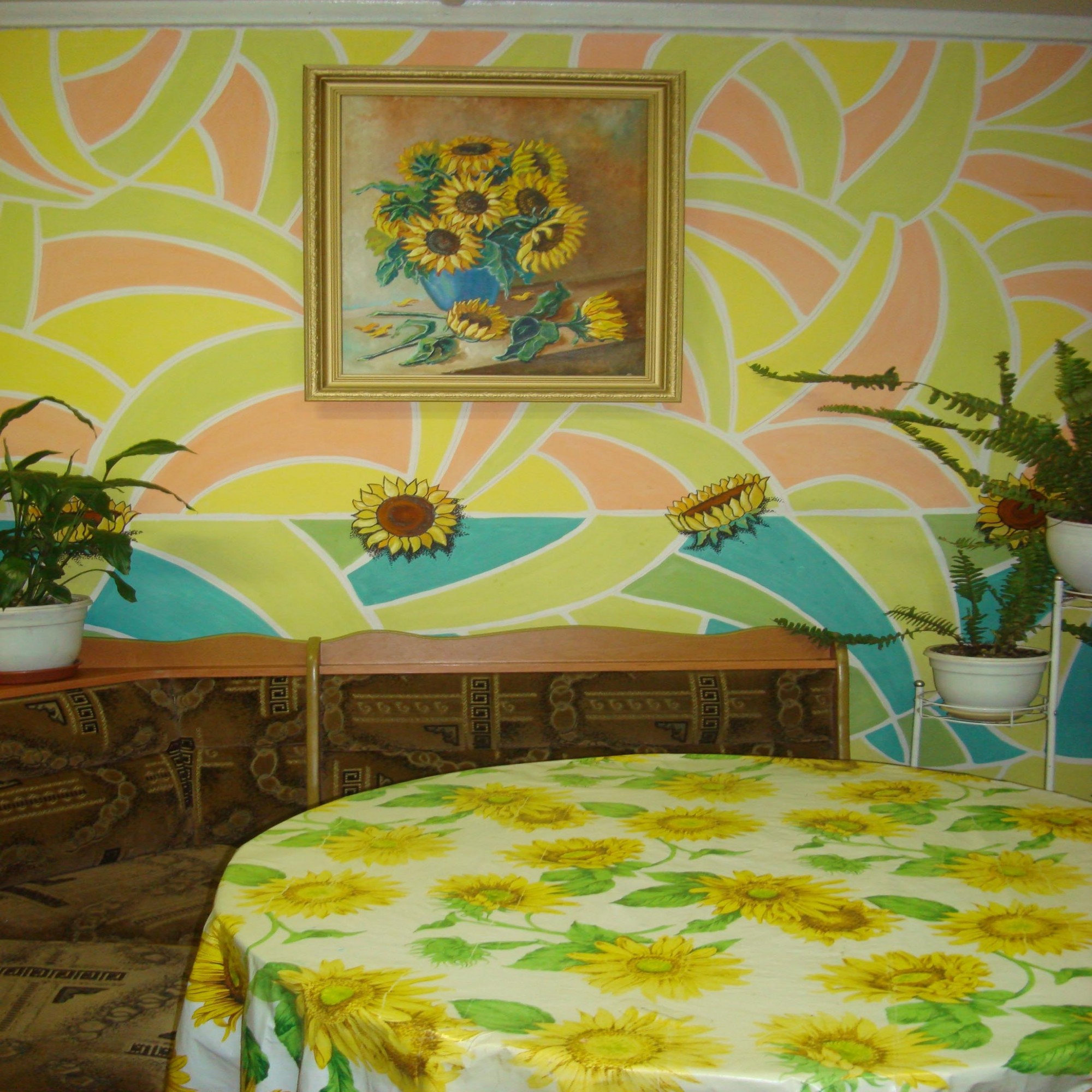 Выровняли стены, зашпатлевали и побелили водоэмульсионкой. У нас получилась кухня (14,5 кв.м). С цветами, которые хотелось бы видеть на кухне, я давно определилась. Только не знала, как именно красить.Красить решили единогласно, так как намучались с обоями в своей старой кухне. Там отходит, там облили и т.д. Но как только я увидела чистые, ровные белые стены…. Это как чистый холст перед глазами. Сразу родилась идея! Взяв карандаш, я нанесла рисунок в хаотичном порядке. Чтобы получить нужные цвета в эмульсионную краску добавили соответствующий колер и размешали. Все краска готова к употреблению. В разные емкости навели нужные цвета, и началась работа. Сразу вспомнилось детство, любимые разукраски. Даже дети в этом приняли участие. Когда стены «разукрасились» их оставили сохнуть. А в это время сделали трафареты подсолнухов и определили места, где они у нас будут красоваться