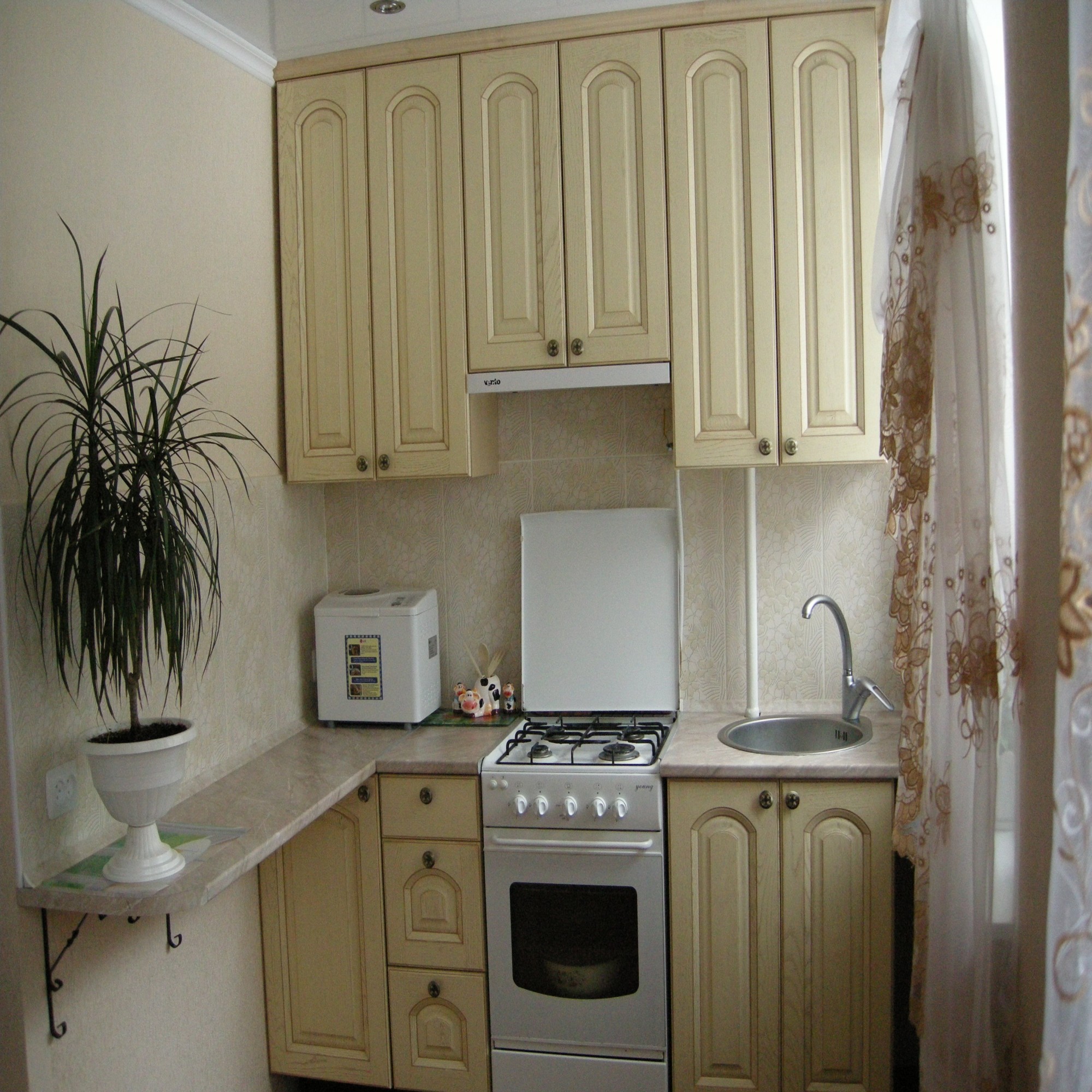 Почему высокие шкафы? Они прекрасно скрывают трубы вентиляции. Законченный вид шкафам предает мебельный карниз - его покупали отдельно.