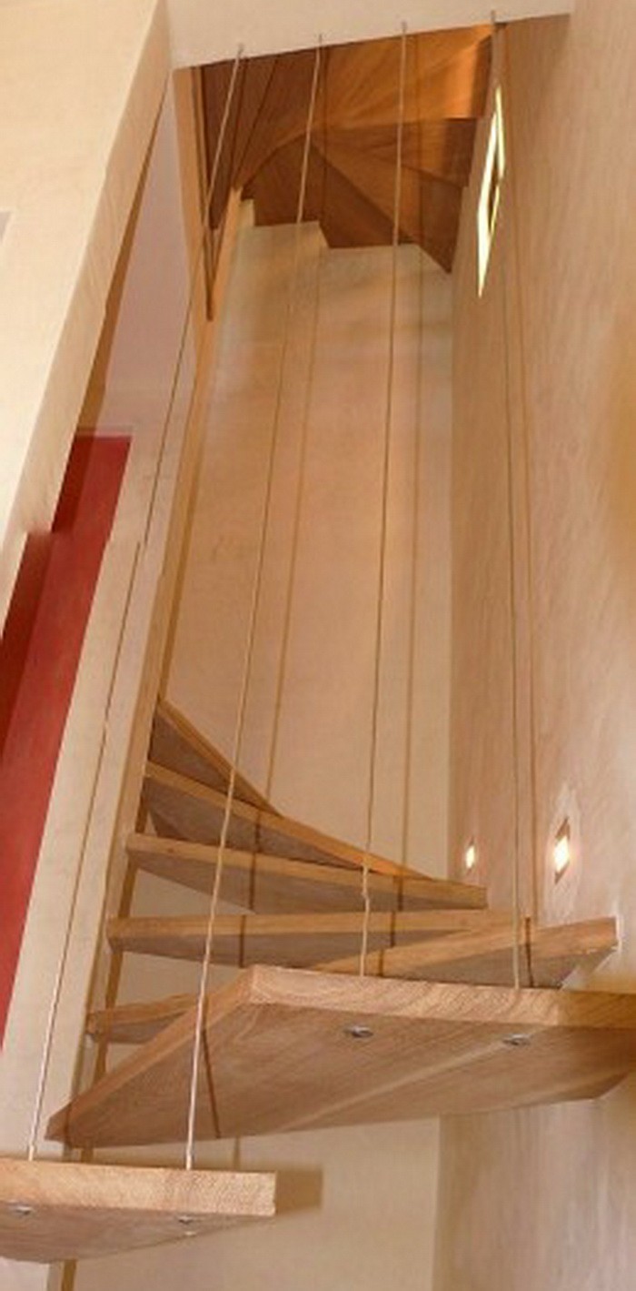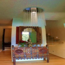 Так лестница выглядит со стороны гостиной. Здесь стену украшает старинное зеркало и подходящий по стилю индийский комод.