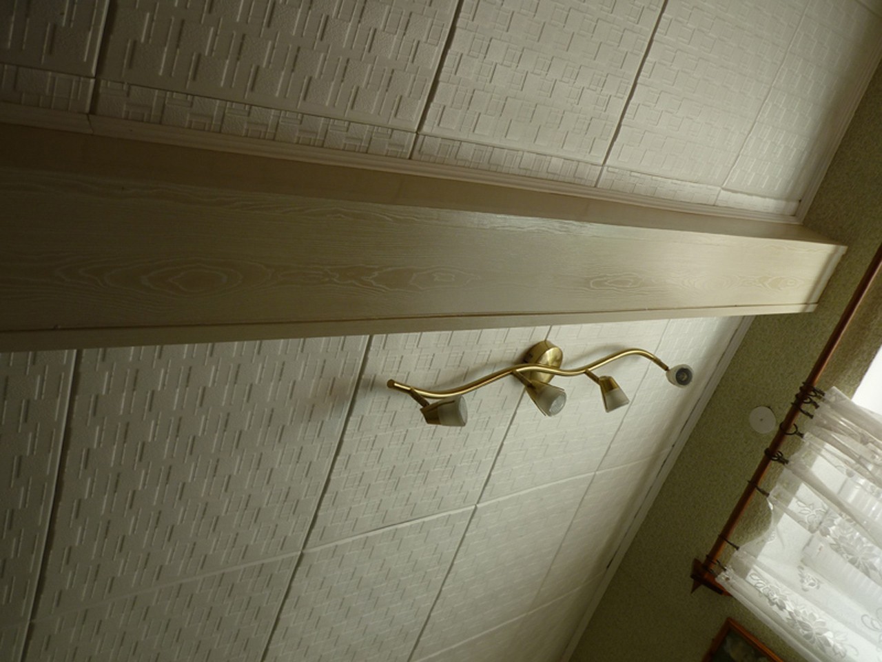 балку, которая держит потолок, обшили пластиком получилось как - будто балка состоит из цельного дерева, повесили красивый светильник