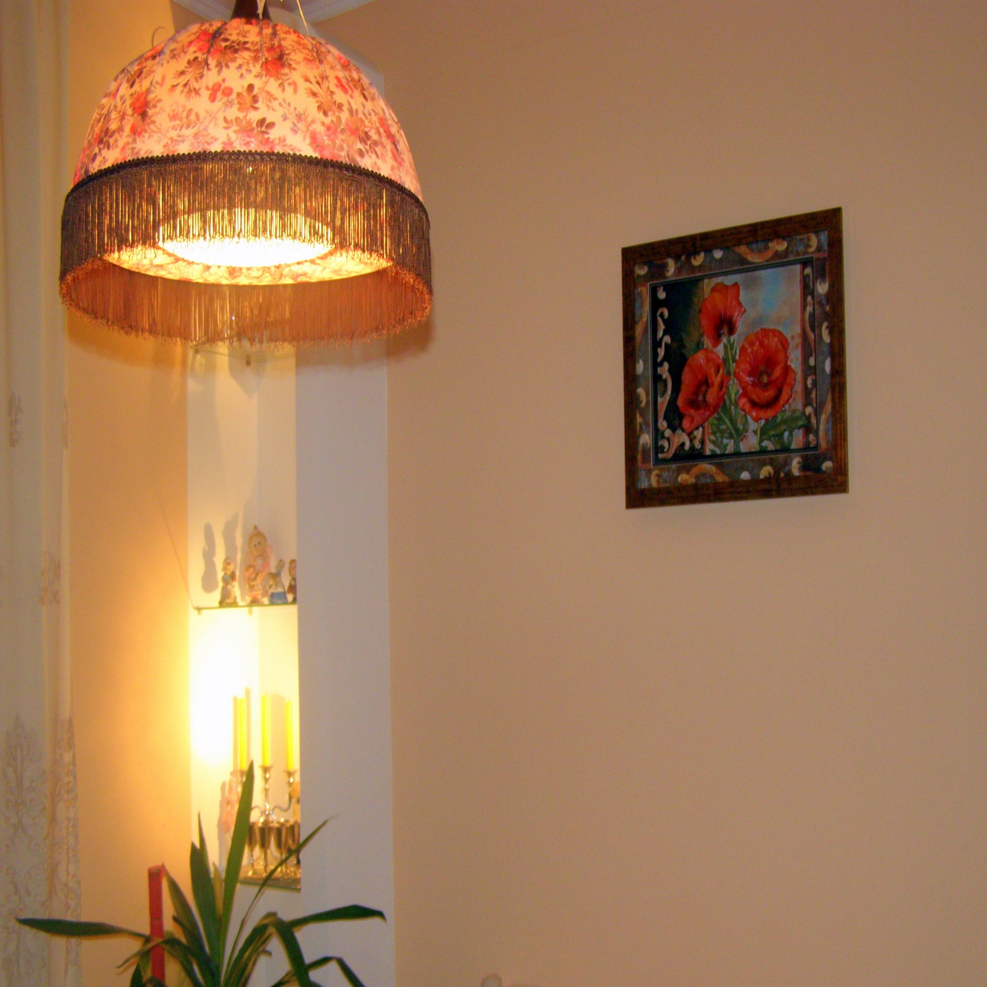 Круглый абажур из ткани превращает гостинную-столовую в идеальное место для долгих застолий и для игры в карты, например. К тому же, и стол у нас - круглый!