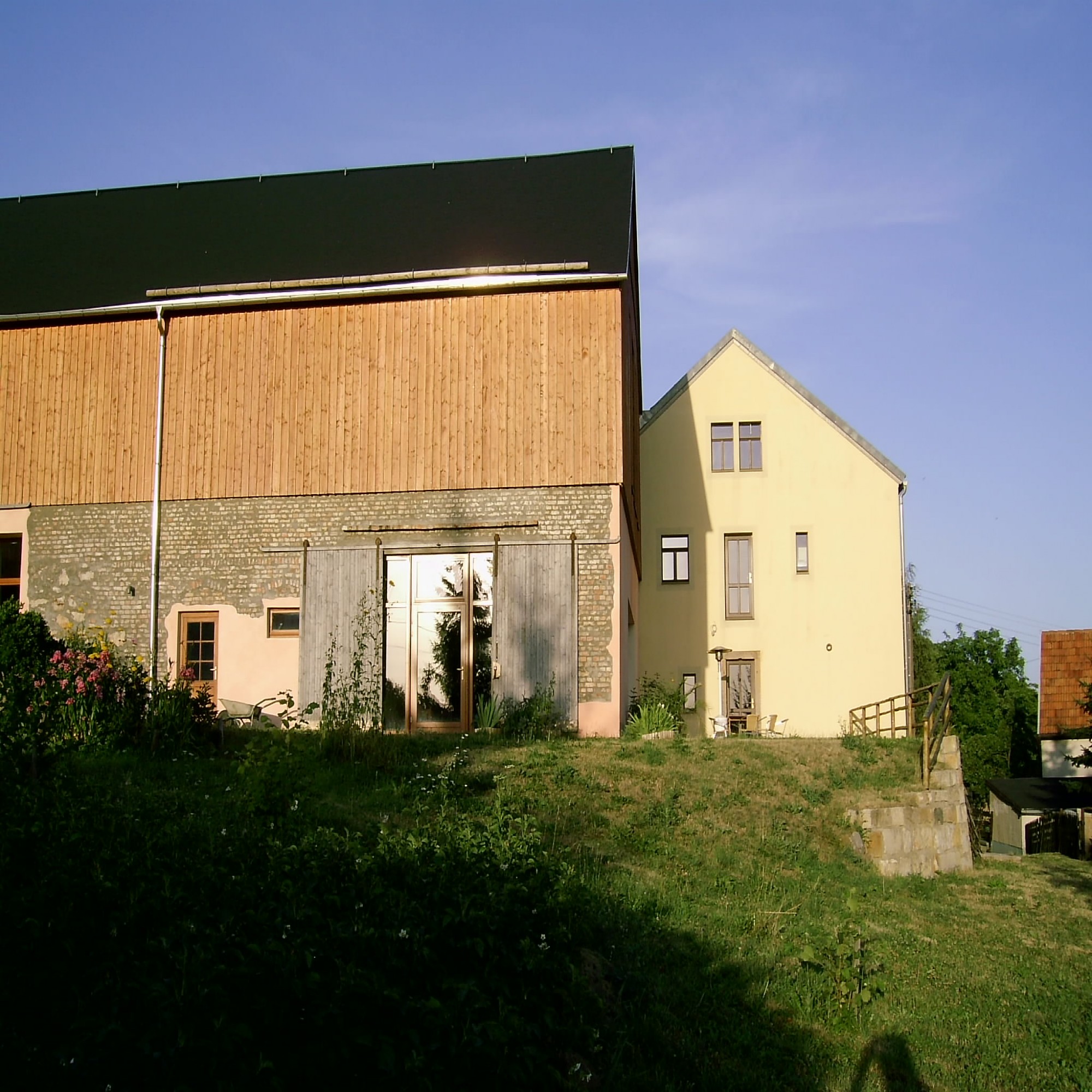 На террасе расположен стол со стульями, гриль и обогревательный прибор. Терраса веде в сад.