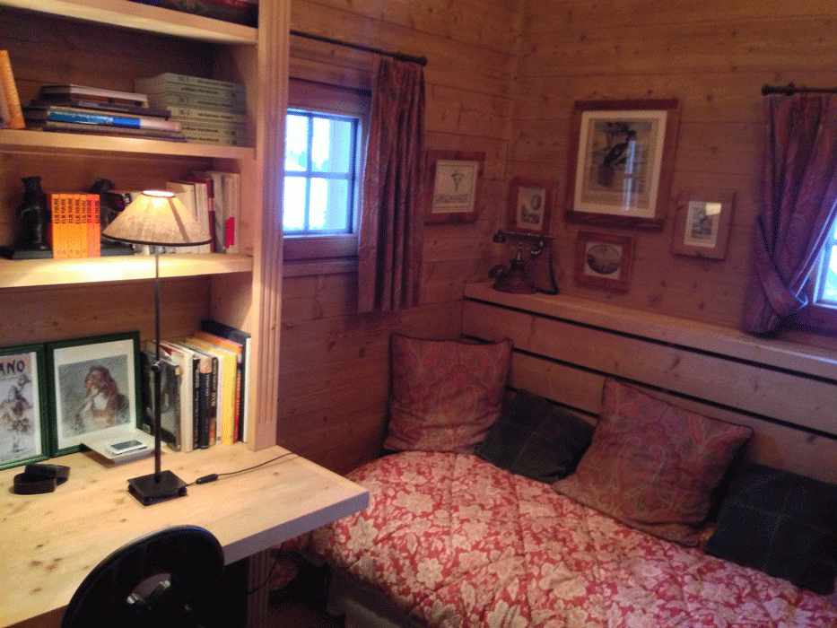 Здесь видна кровать, являющаяся в то же время диваном, на котором можно полежать. Слева вы можете увидеть письменный стол. На нем стоит небольшая лампа.