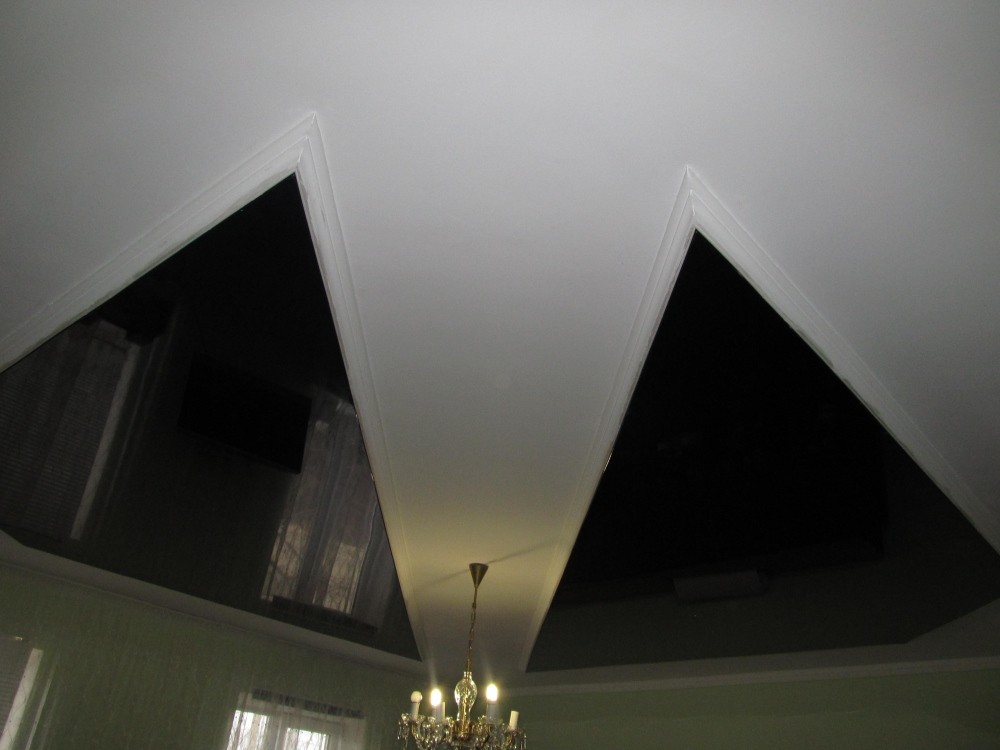 Интерьер фото / Наши интерьеры - дома / Гостиные в домах / Как смотрится натяжной потолок в гостиной? / Равнобедренный треугольник на потолке.