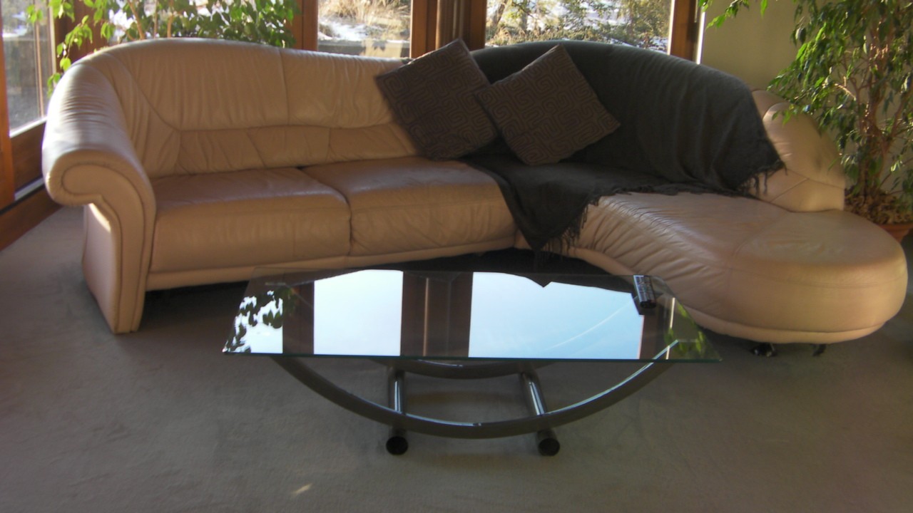К окну мы поставили диван в форме буквы "Г". Диван сделан из мягкой кожи светло-бежевого цвета, покрыт шерстяным пледом темно-коричневого цвета, и к нему добавлены шелковые подушки темно-серого цвета. Они удачно дополняют диван и их всегда можно подложить под спину или под голову.