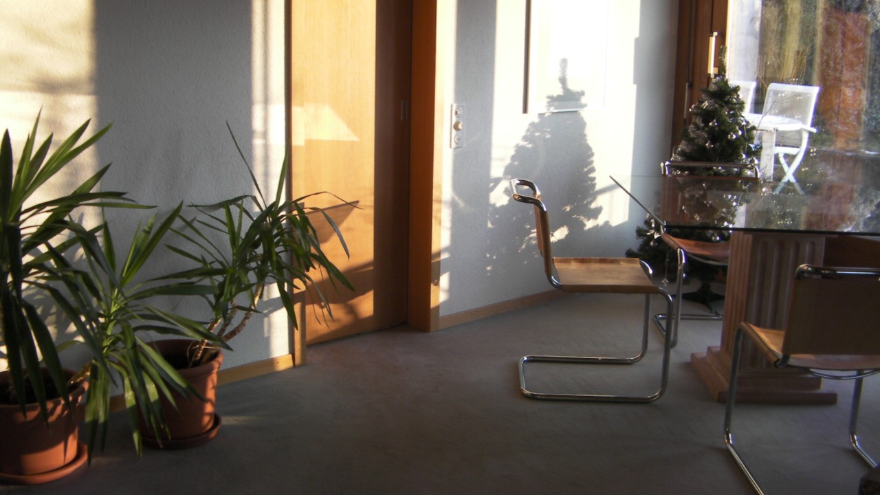 Стол и четыре стула мы поставили в нишу, там же уместились две небольшие пальмы.