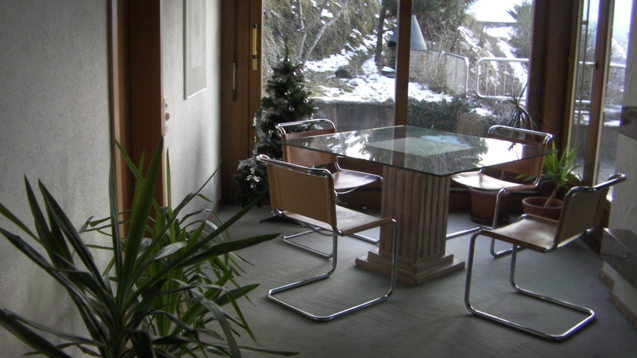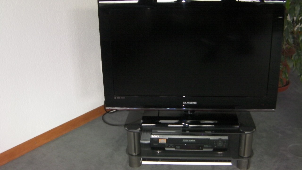 Напротив дивана стоит плазменный телевизор. Тумбочку для него мы купили под стать журнальному столику - из стекла и металла. Размеры тумбочки позволяют поставить туда два видеоплейера.