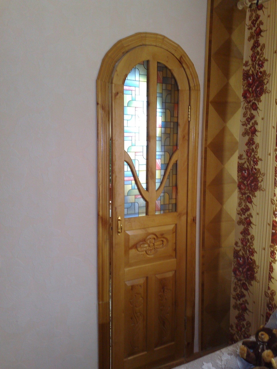 Декоративная дверь арочной формы. Дерево ольха с художественной резьбой. Стёкла обклеены витражной плёнкой.