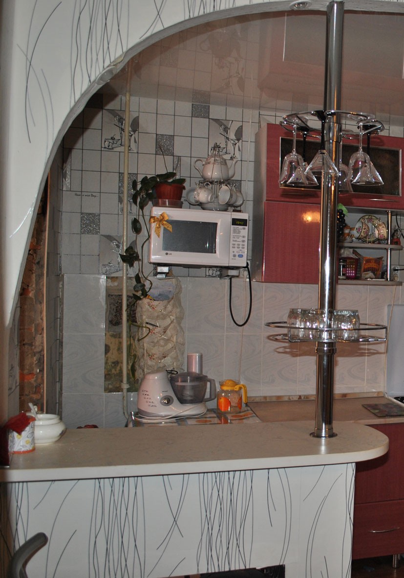 Барная стойка. Чтобы ее сделать, мы полностью выломали пол стены и снова собрали арку и простенок под столешницей.