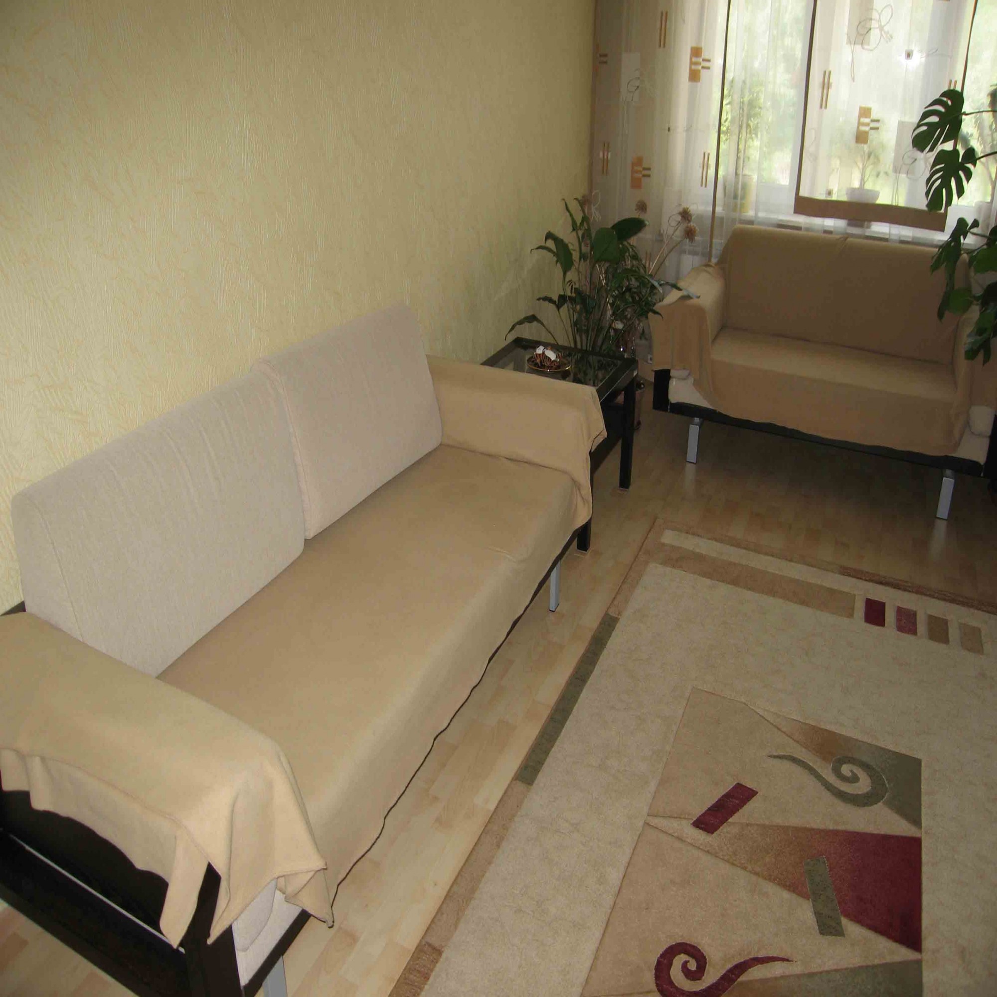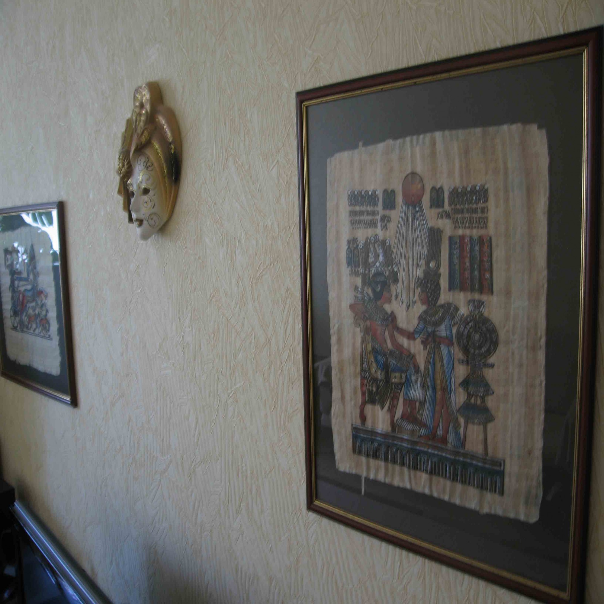 Мы долго не знали чем украсить пустующую стену, но сейчас, прямо над телевизором, расположились два папируса и маска.