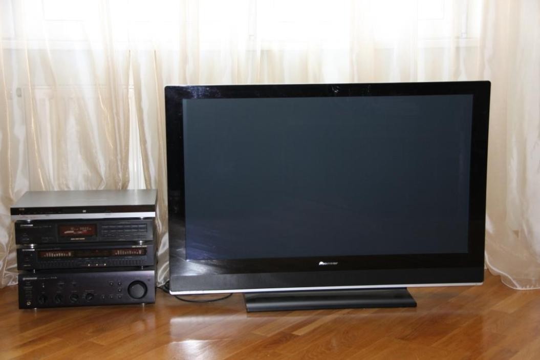 Аппаратура пока находится на полу перед диваном. Решение о том, какая тумбочка подойдет для использования, пока не принято.