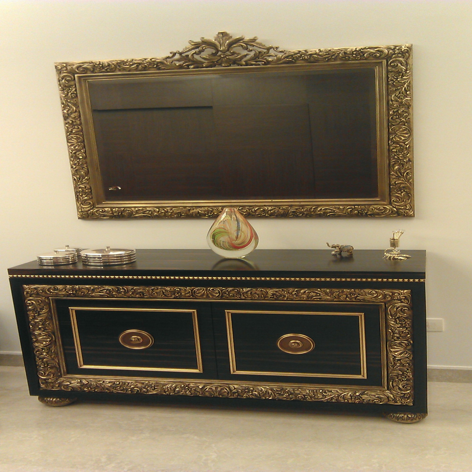 Зеркало и сервант выполнены в класическом стиле,сочетаются между собой деревянной резной рамкой ручной работы