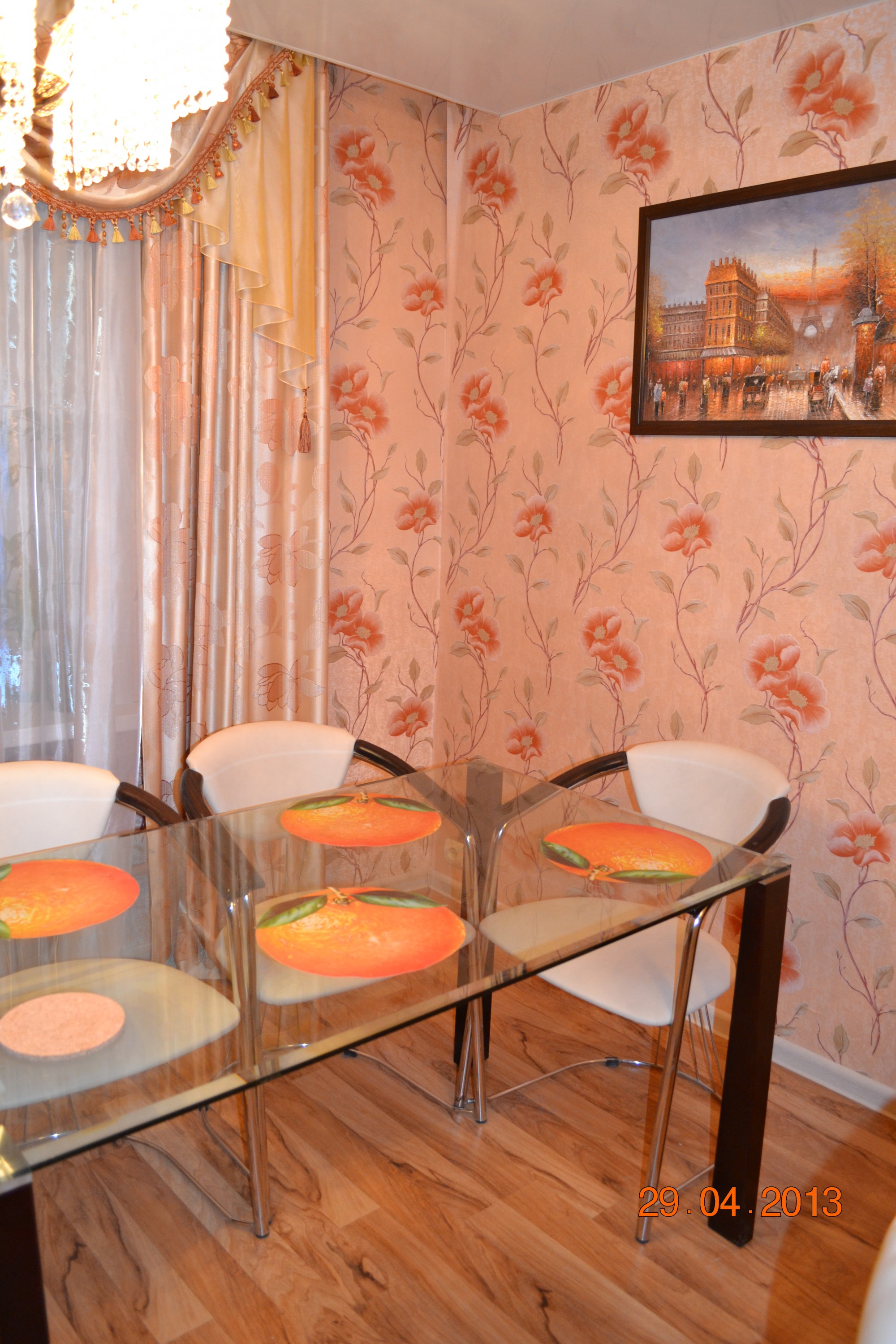 Как вы уже успели догадаться, здесь мы обычно едим. Главными "изюминками" этой зоны являются стеклянный стол, хрустальная люстра и картина на стене.