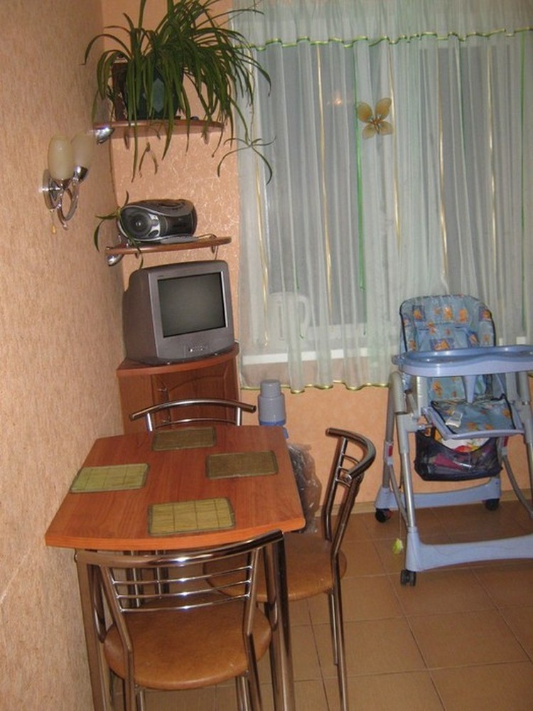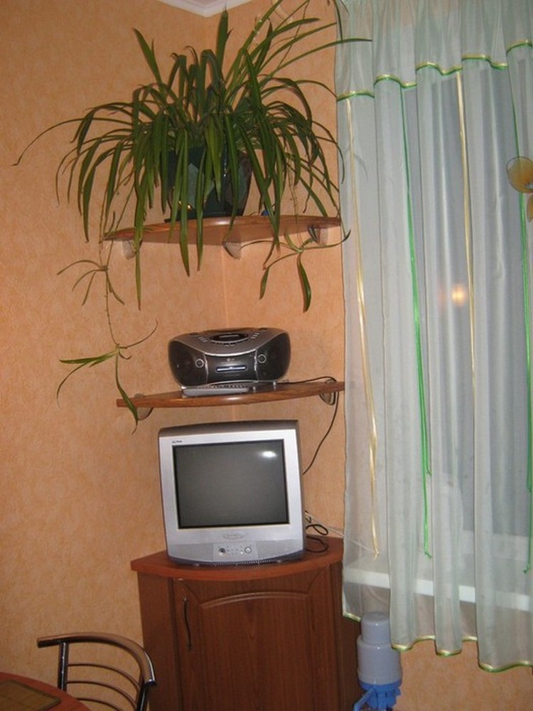 А этот уголок мама подсмотрела у одной своей знакомой. Нам он пришёлся по вкусу. На верхней полке поселился цветок, на средней магнитофон, на нижней телевизор.