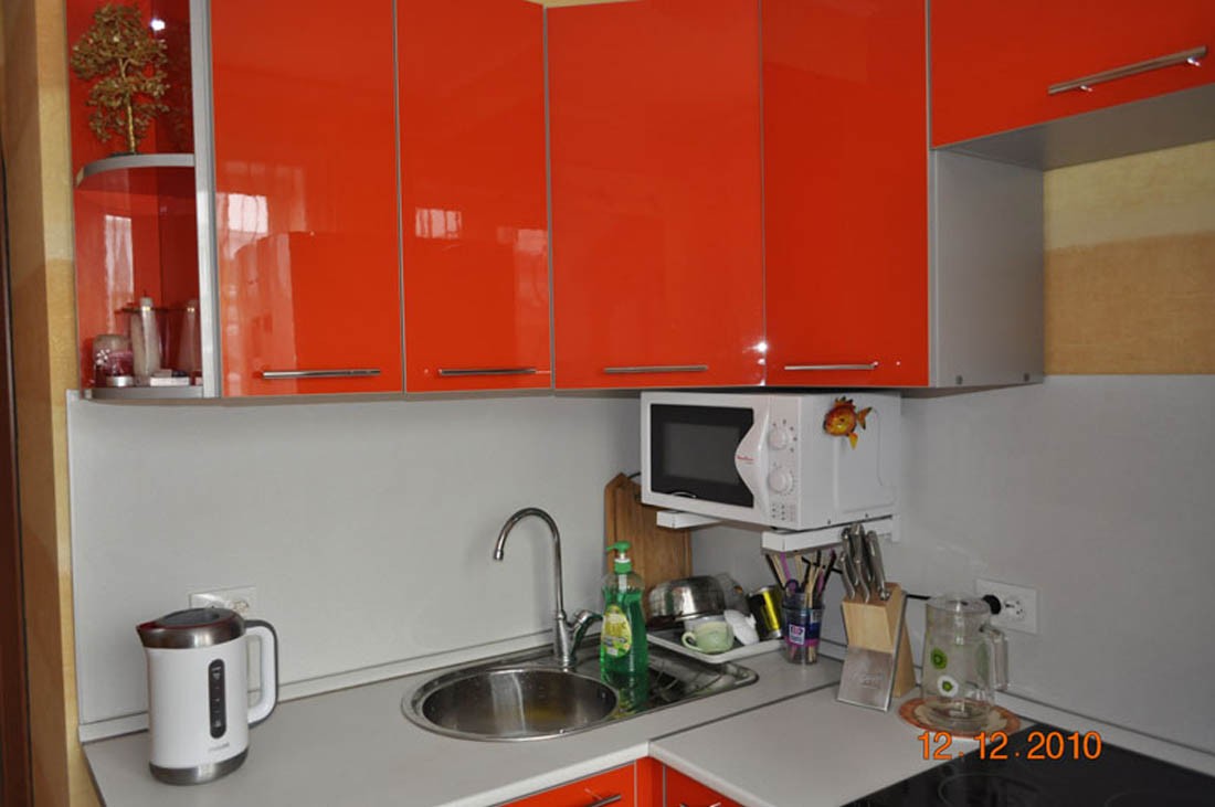 Сюда отлично подошла маленькая круглая мойка. Очень красиво смотрится боковая полочка, на которую можно размещать разные предметы декора.