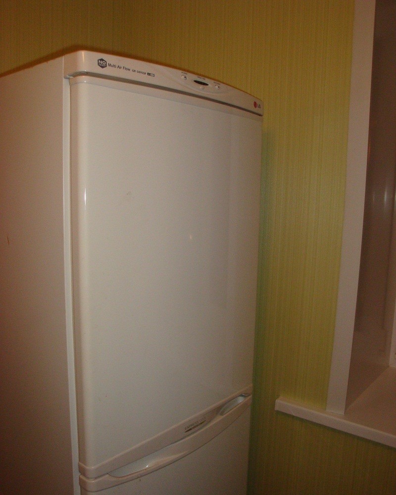 Главная вещь кухни – большой холодильник. Он стандартного белого цвета, в самый раз для кухни. Другой цвет холодильника только бы уменьшал зрительно пространство, а так он освежает обстановку.
