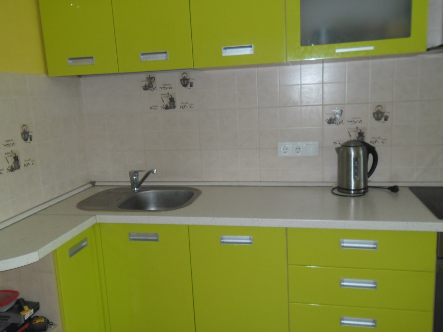 Умывальник установлен обыкновенный, с шариковым краном, шкафчики в кухне зелёного цвета с металлическими ручками.