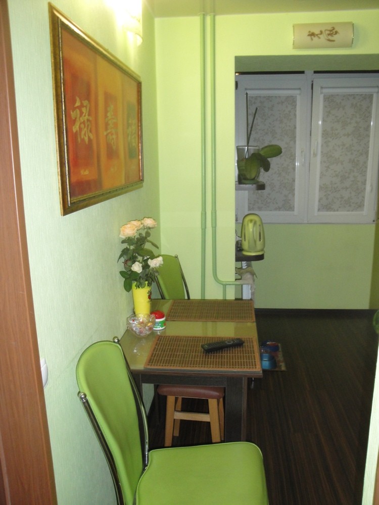 Этот вид перед вам предстаёт при входе на кухню. Стены окрашены в рискованный салатовый цвет, но очень светлого оттенка.