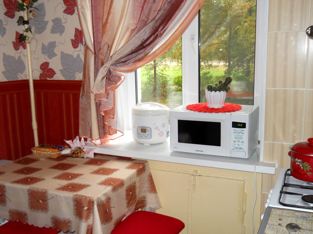 Мультиварка и микроволновая печь убраны на подоконник, чтобы не занимать пространство на столах. Под кактусом связанная крючком салфетка.