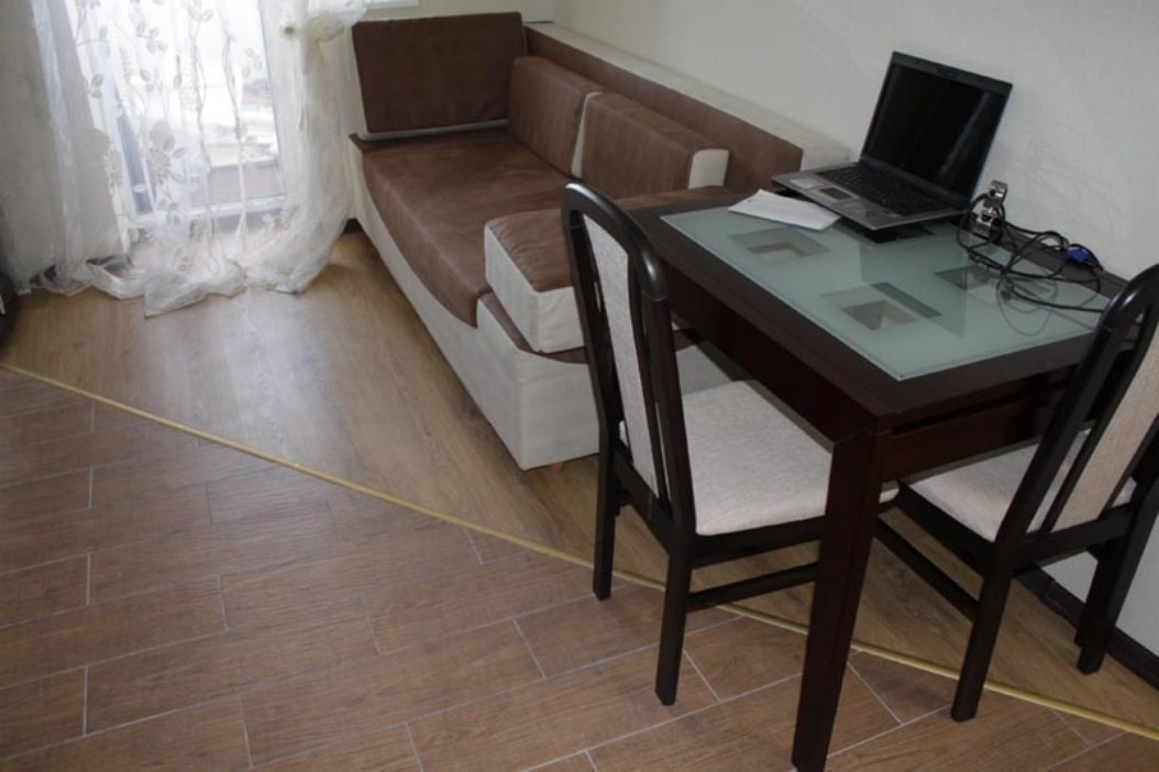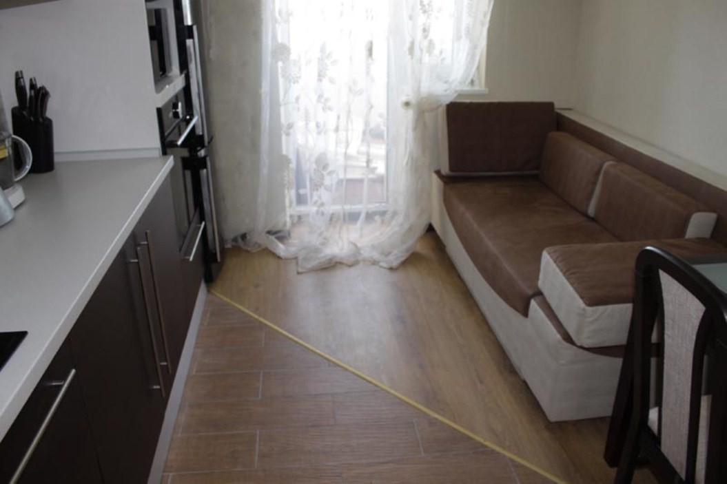 Использовано 2 вида ламината, для подчеркивания отдельных зон кухни. Да и вообще такое оформление смотрится не обычно и ни у кого такого нет!