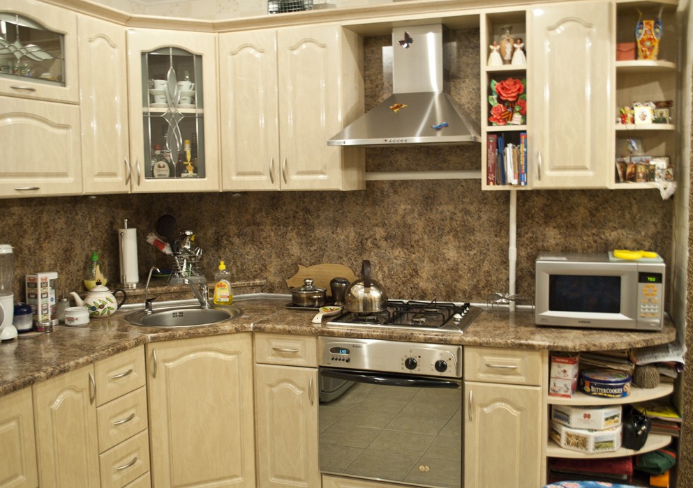 В целом приятный дизайн кухни из МДФ сливочного цвета, жаль, что выбрали не матовый, а глянцевый вариант. Не понравилось обилие вещей, не имеющих к кухне отношения, захламляющих консоли. Из-за них создается впечатление неухоженности помещения - как на чердаке. |
