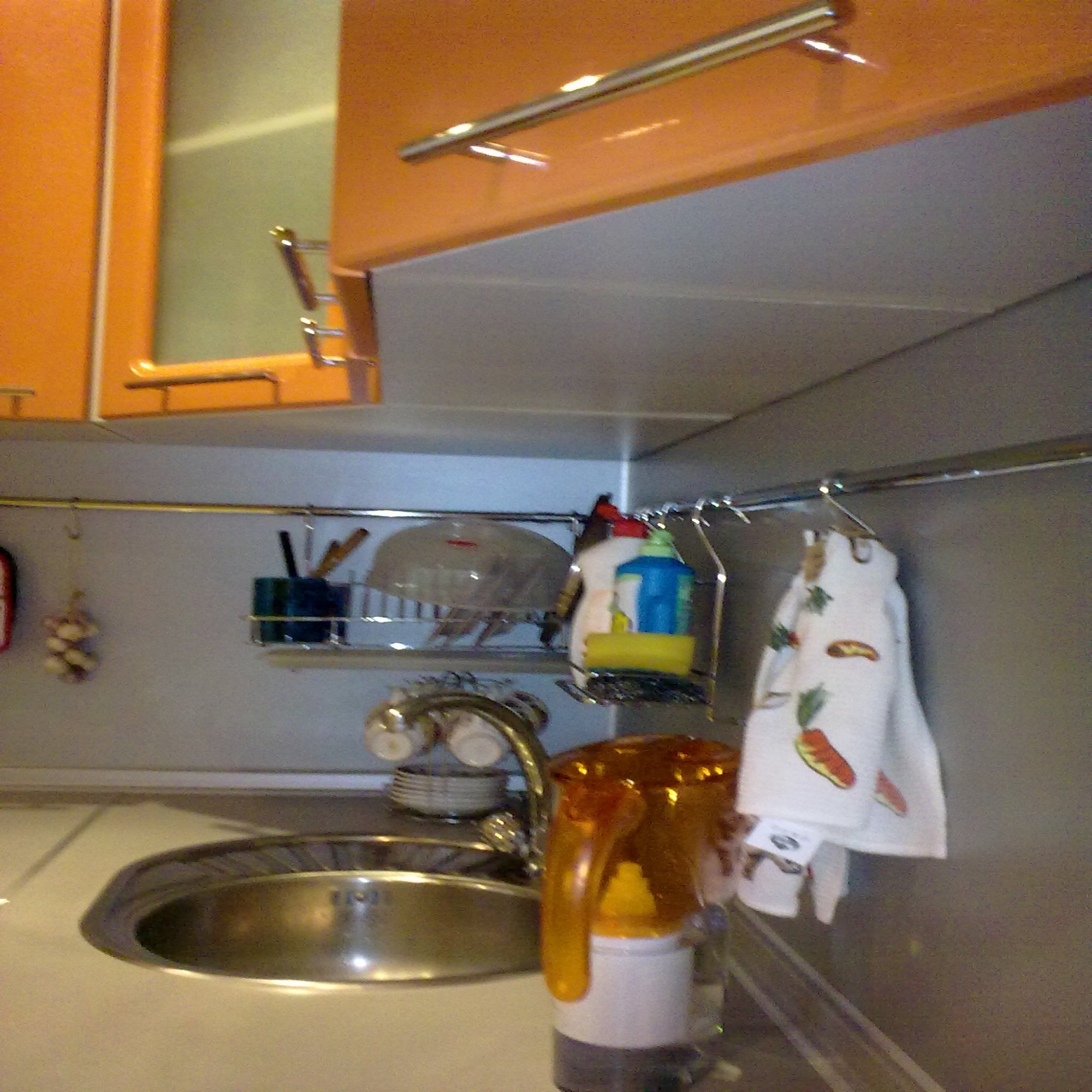 На этом фото можно увидеть часть гарнитура, а под ним штанга, на которой с легкостью крепятся полочки и крючочки, на которых размещается посуда, моющие средства, полотенца и многое другое.