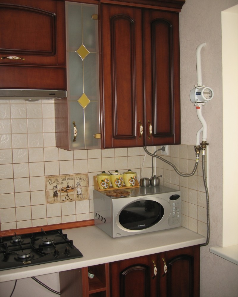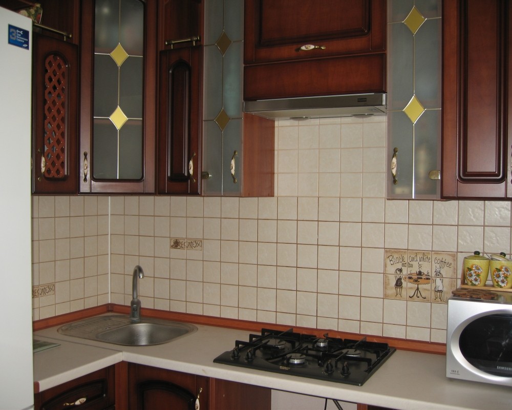 Кухонный гарнитур сделан под дерево. Тонирован, что придает кухне изысканности. выглядит очень дорого и красиво.