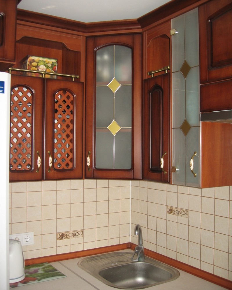 Угловая дверка сделана на искосок, благодаря чему этот шкафчик получился очень вместительным. Для удобства, над мойкой разместили сушку для посуды. Дверки решотчатые специально для проветривания.