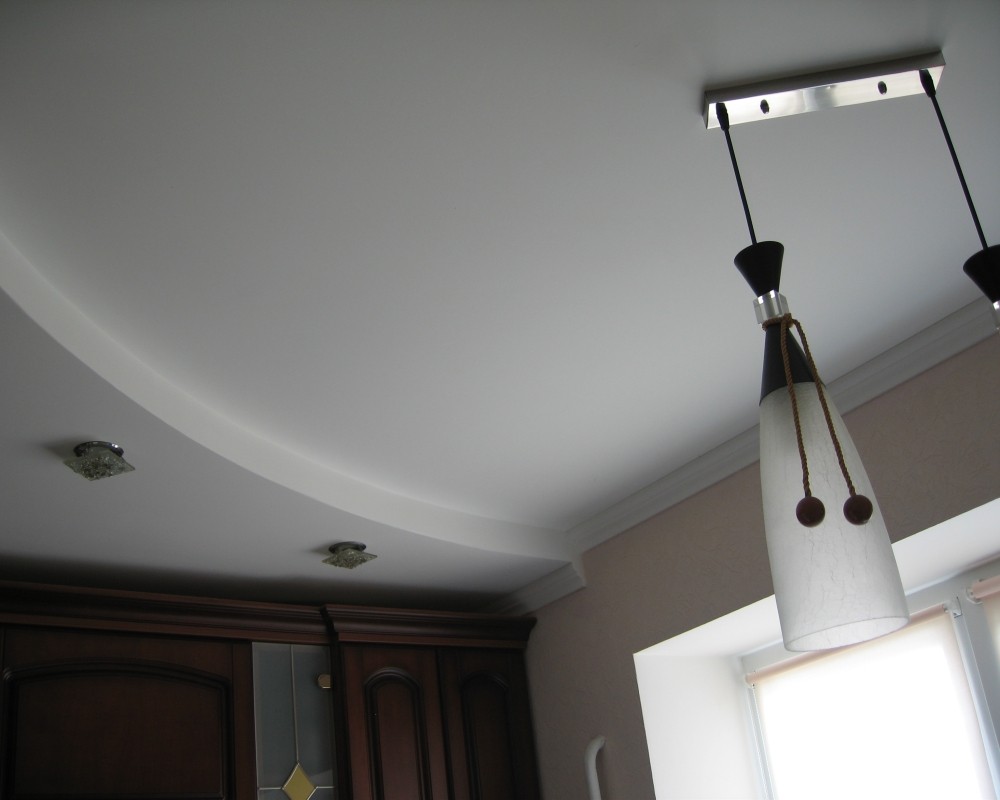 Потолок сделали двухярусный. Нижний ярус в виде полукруга. На нем расположены три потолочных светильника. А над столом висит люстра с двумя плафонами с таким же матовым стеклом, как на фасаде кухни.
