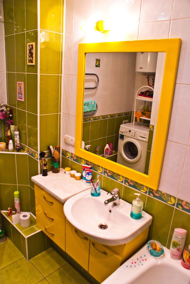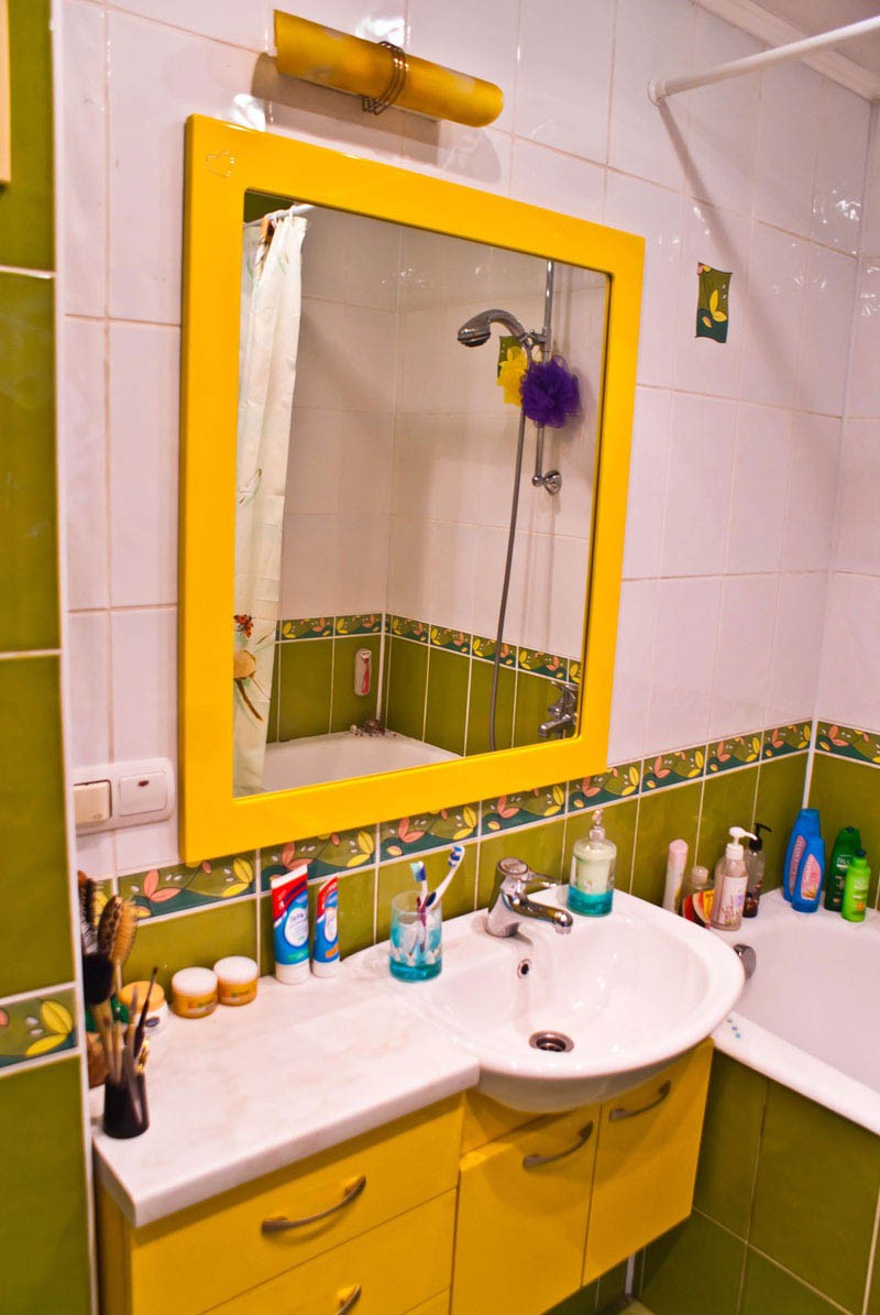 Зеркало также желтого цвета, оно эксклюзивное и красивое, а над ним имеется небольшой светильник такого же цвета.