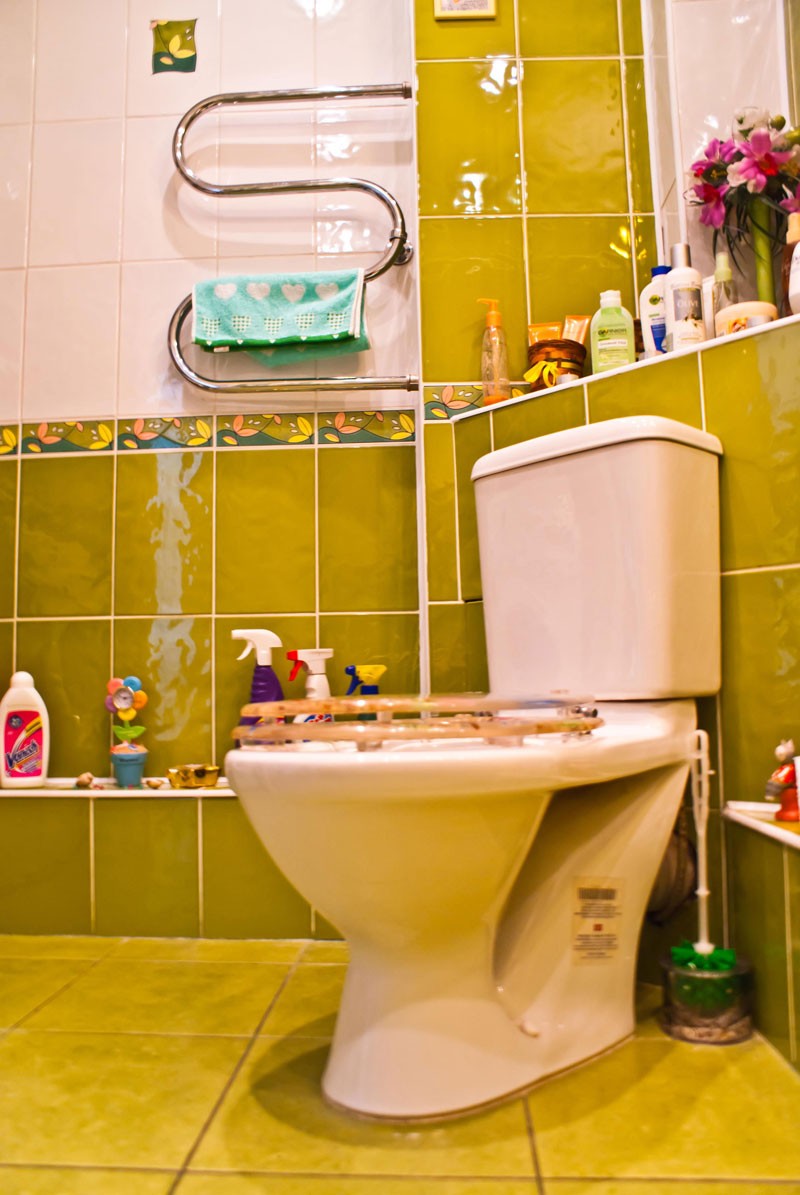 Унитаз устанавливали простой, финского производства. В углу, где расположен унитаз, мы спрятали всевозможные трубы. В случае, когда нужно пробраться к трубам, нужно снять одну кафельную плитку.