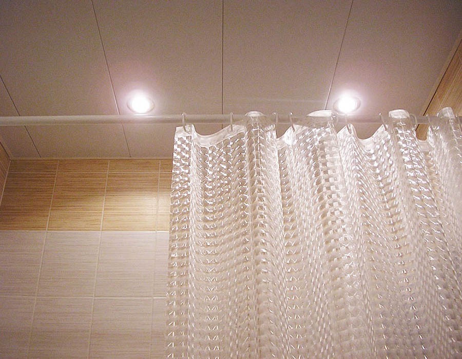 Эту шторку подобрали в магазине сантехники. Она не пропускает воду, и отлично подходит под цвет плитки.