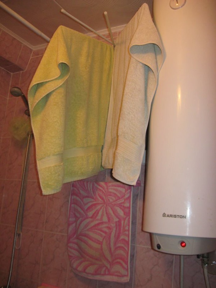 Самая большая проблема маленькой ванны - где сушить большие банные полотенца? А если семья из 3-4 человек? Решение - под потолком!