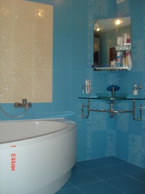 Очень здорово, плитка сначала по цвету напомнила немного советскую краску в ваннах и туалетах, но когда стала рассматривать ближе, то такое чувство абсолютно исчезло. Все, можно сказать, идеально. Стеклянная раковина слегка настораживает, но вы, судя по всему, - новатор. Очень хорошо! |