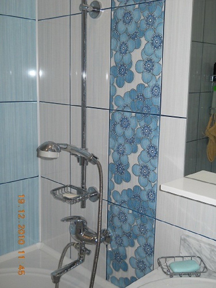 Интерьер фото / Наши интерьеры - квартиры / Ванные комнаты, фото ванной / Ванная комната с декором "Ромашки". / Контрастные стены