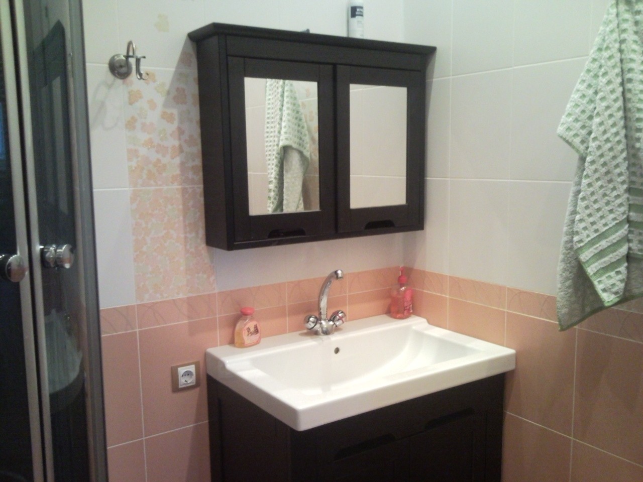 Интерьер фото / Наши интерьеры - квартиры / Ванные комнаты, фото ванной / Место где я с удовольствием читаю М.А. Булгакова и принимаю душ. / Тумба и шкаф