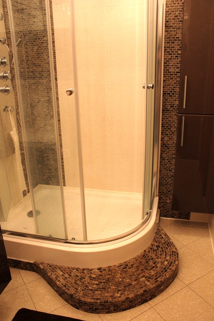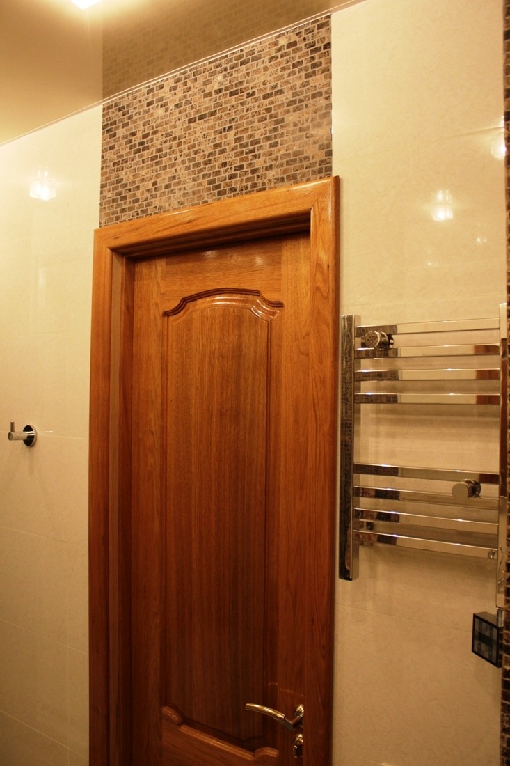 Интерьер фото / Наши интерьеры - квартиры / Ванные комнаты, фото ванной / Итальянская мозаика в типичной ванной комнате / Дверь натуральная.Орех