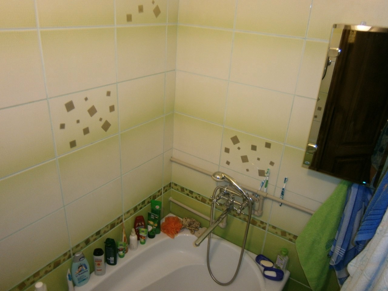 Таким образом, у нас получился не совсем явный переход от темно-зеленого к белому потолку. Вместо обычного зеркала повесили шкафчик, решив максимально полезно использовать небольшое пространство.