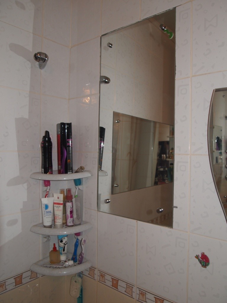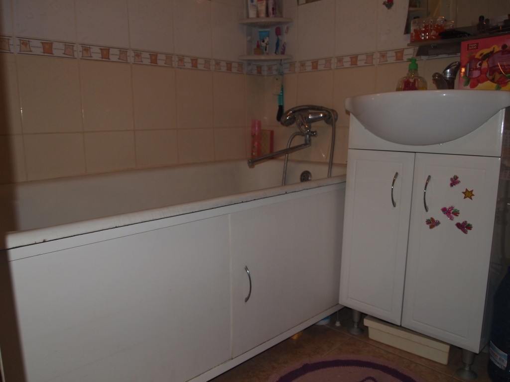 Вместо стандартного умывальника было отдано предпочтение такой вот тумбе, а несовершенство старой ванной скрыто за такими вот ездящими панелями.