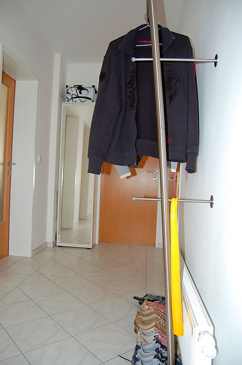 Входная белая дверь и деревянная дверь в ванную комнату. Как видно, в дневное время включать свет нет необходимости.
